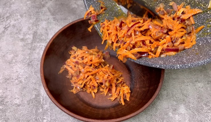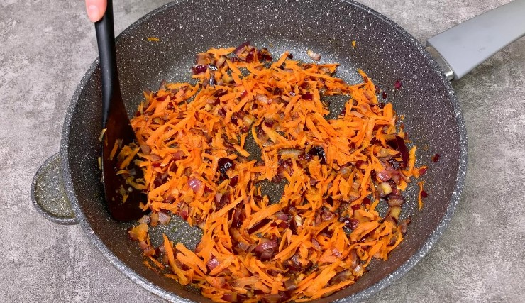 1. У сковороду з олією відправляємо цибулю кубиком, обсмажуємо 2-3 хвилини, потім додаємо терту моркву і готуємо все разом ще 3-4 хвилини.
