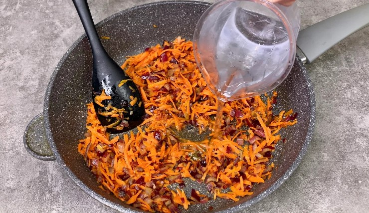 2. Вливаємо гарячу воду і тушкуємо до м’якості моркви та повного випарювання рідини.