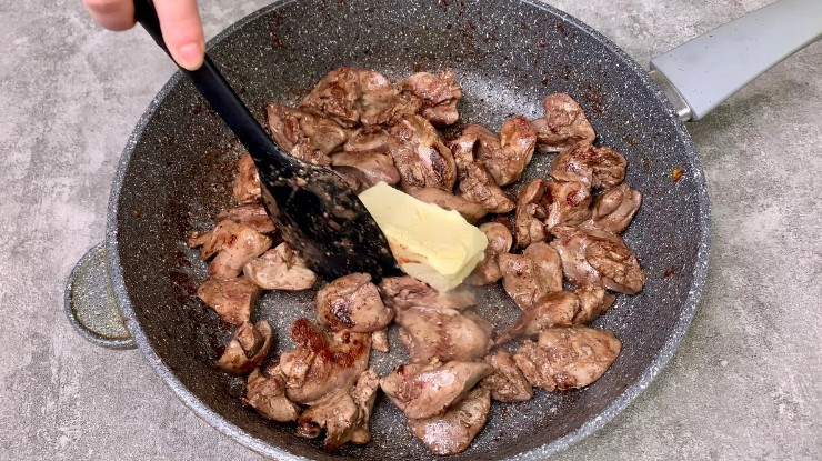 4. У ту ж сковороду відправляємо курячу печінку, смажимо спочатку на сильному вогні до золотистості, потім зменшуємо вогонь до мінімуму, закладаємо вершкове масло та готуємо до готовності печінки.