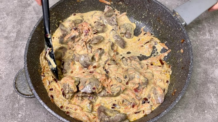 5. Як тільки печінка готова, додаємо засмажку, вливаємо вершки, додаємо сіль, чорний мелений перець і тушкуємо рівно 2 хвилини.