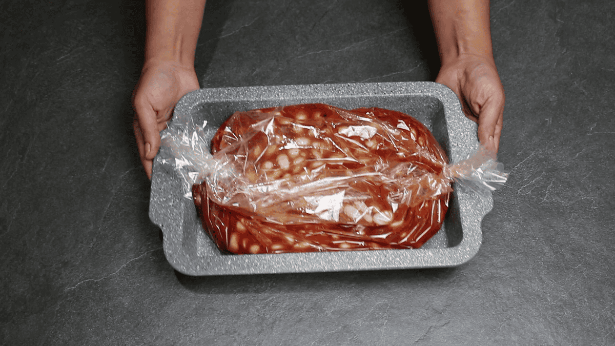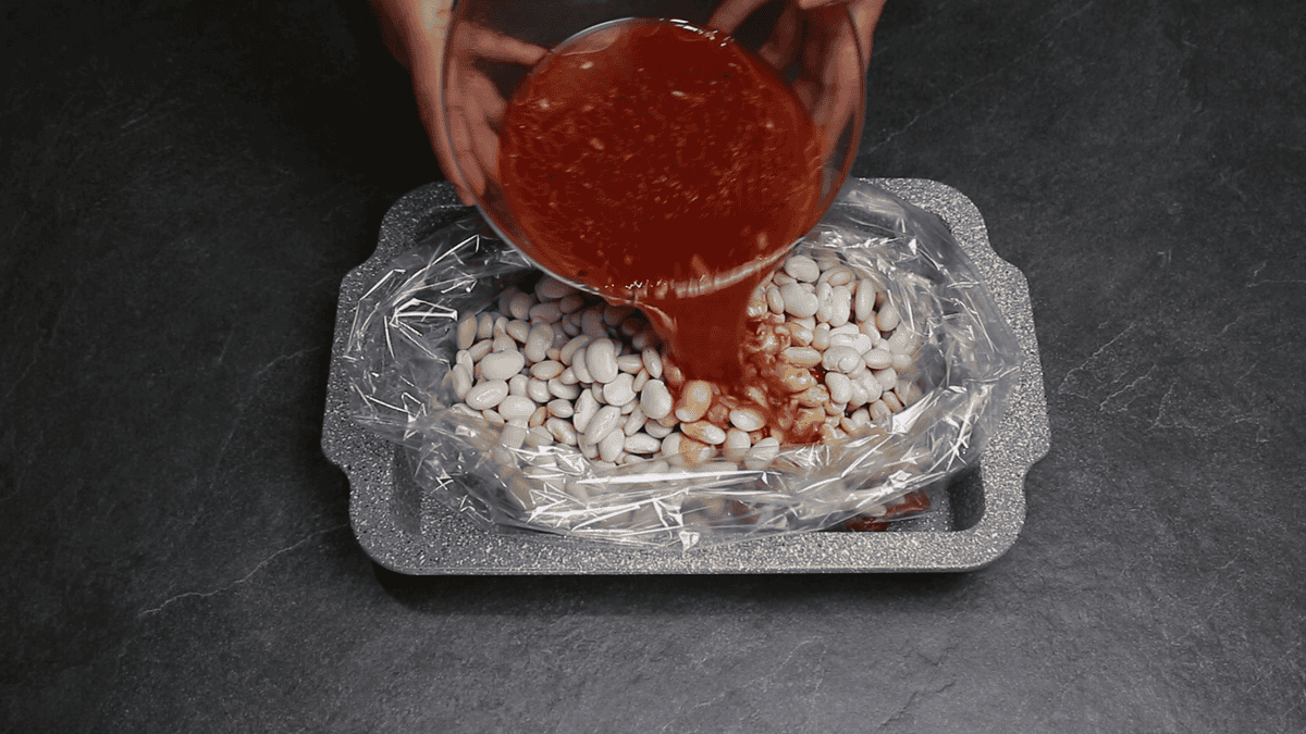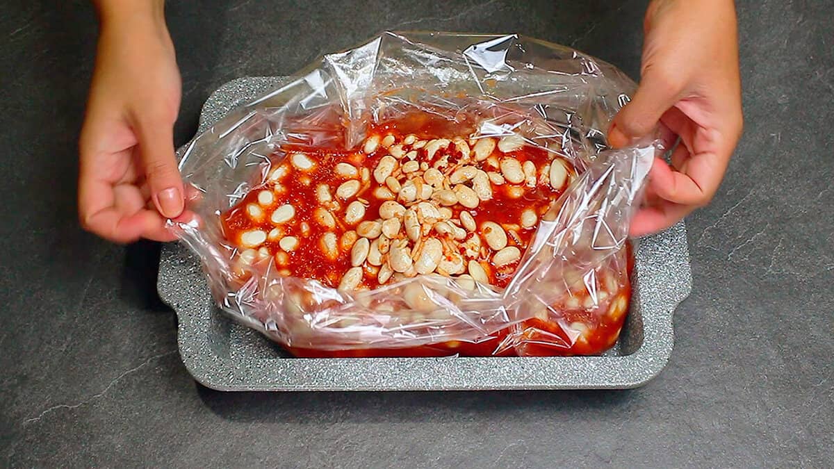 Квасолю я попередньо замочую в теплій воді на кілька годин, а найкраще на ніч. Воду зливаю, добре промиваю квасолю і викладаю її в пакет для запікання.