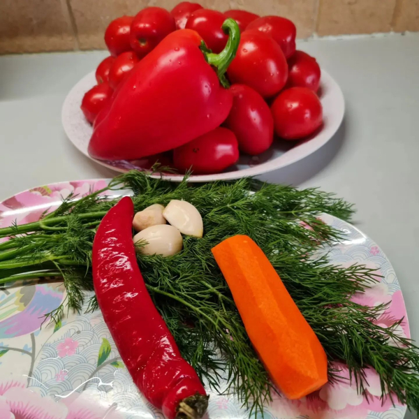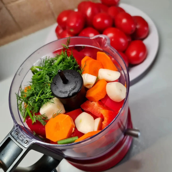 – Перемолоти в блендері або на м’ясорубці: 1 очищений болг перець + 1 перець чилі + 3-4 зубчики часнику + пучок зелені + половину середньої моркви.