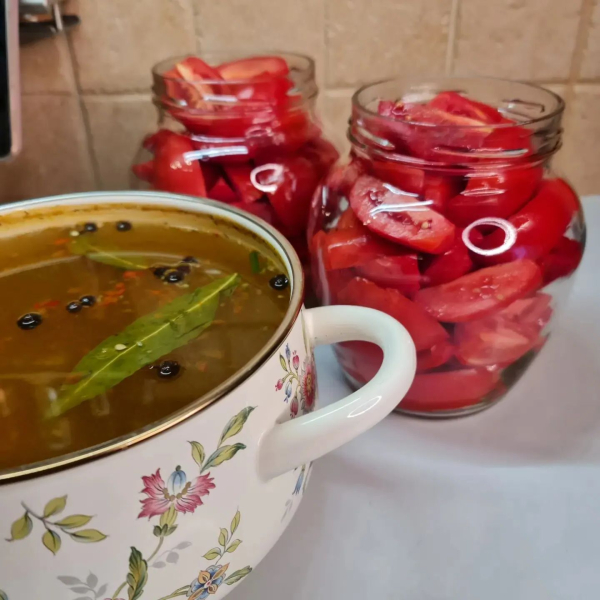 Закип’ятити маринад, остудити до тепла і залити помідори.