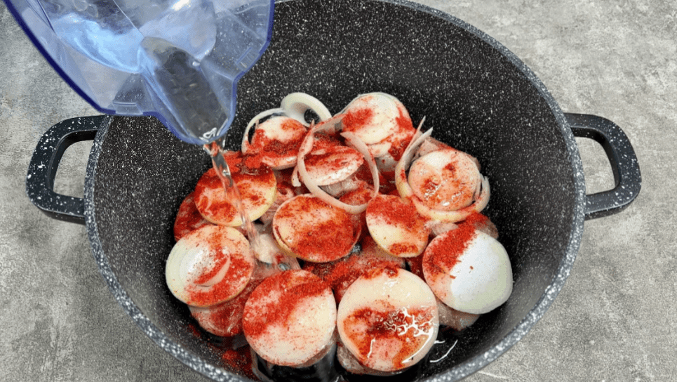 ✅ Всипаємо сіль, цукор, приправу для риби (у мене була універсальна і без солі у складі). Вливаємо олію, 9% оцет і теплу кип’ячену воду. Вода повинна ледь досягати риби. Накриваємо кришкою, ставимо на вогонь, доводимо до кипіння та проварюємо рівно 7 хвилин.