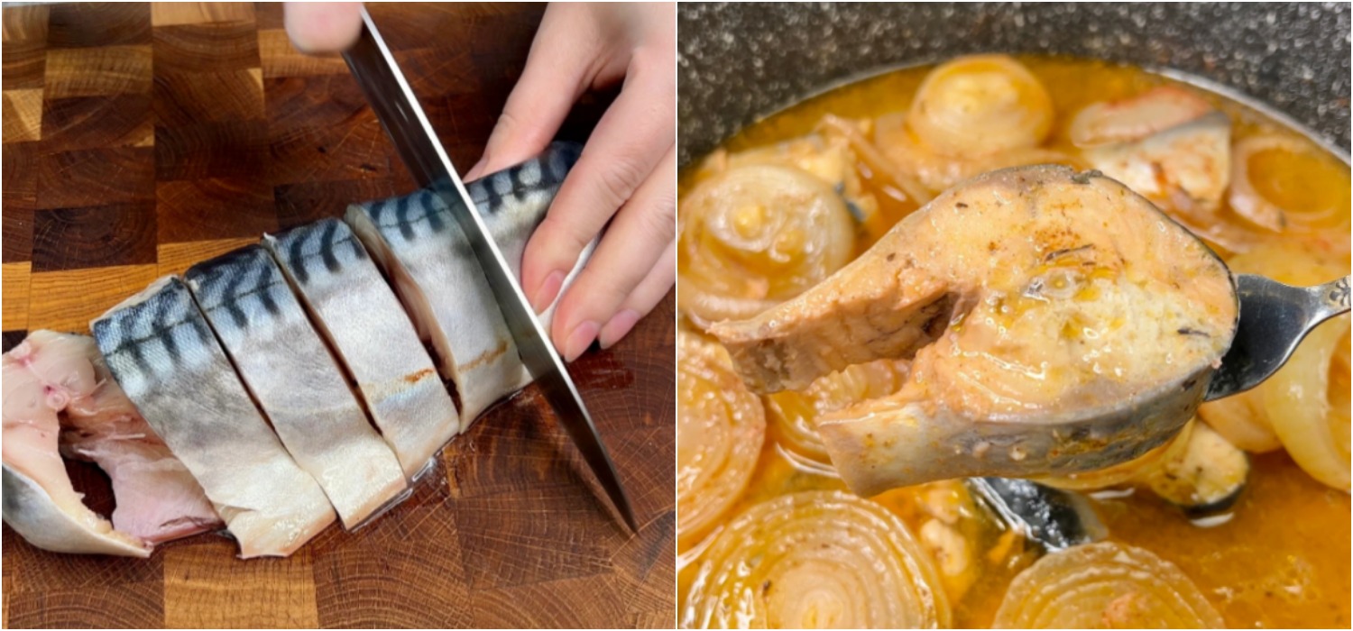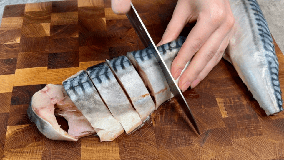 ✅ Скумбрію чистимо від усіх непотрібних “запчастин” та нарізаємо на невеликі порційні шматочки.