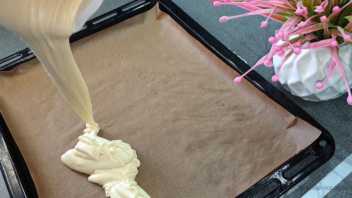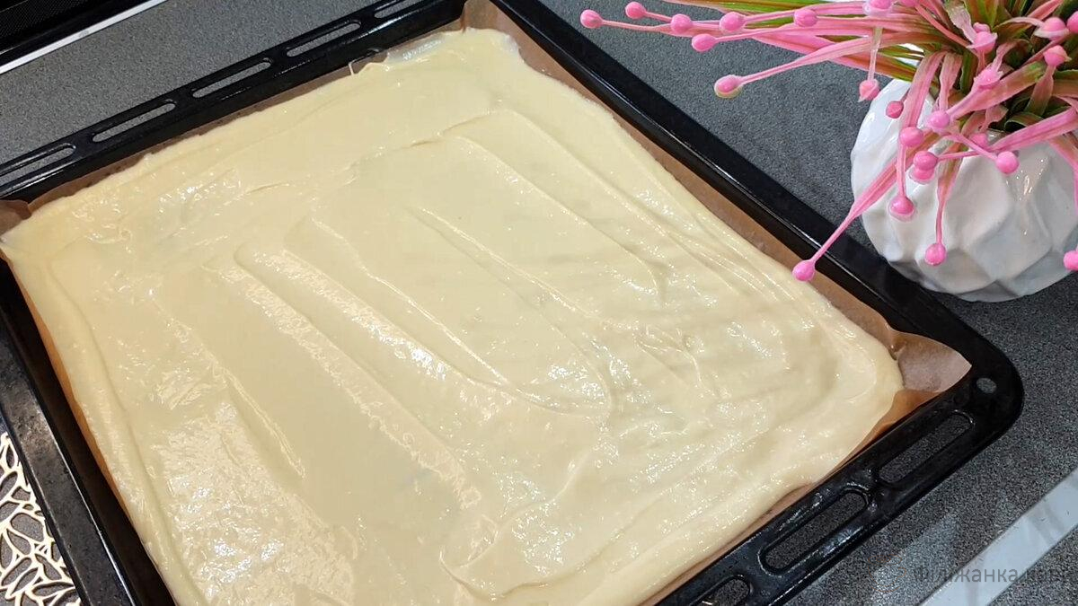 Тісто розподіляю рівним шаром по всій поверхні і відправляю в розігріту духовку.