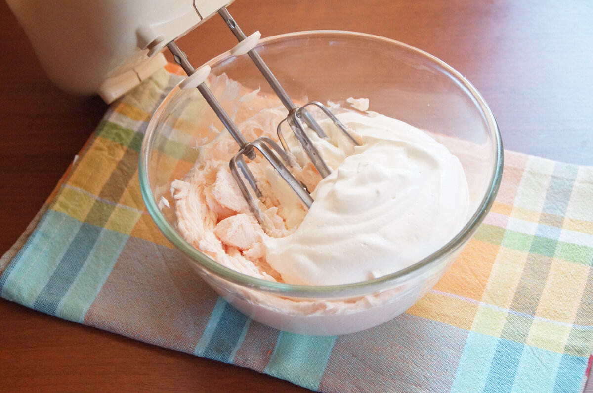 1. Спекти бісквіт – розділити яйця на білки і жовтки. Збити білки до міцної піни, поступово додаючи цукор. По одному додавати жовтки, продовжуючи збивати. Просіяти в яєчну масу борошно і акуратно перемішати лопаткою. Вилити в форму, дно застелити папером для випічки, боки нічим не змащувати. Випікати в розігрітій духовці при 180 г 40 хвилин, остудити в формі. Якщо є можливість, дати бісквіту вистоятися близько 8 годин.