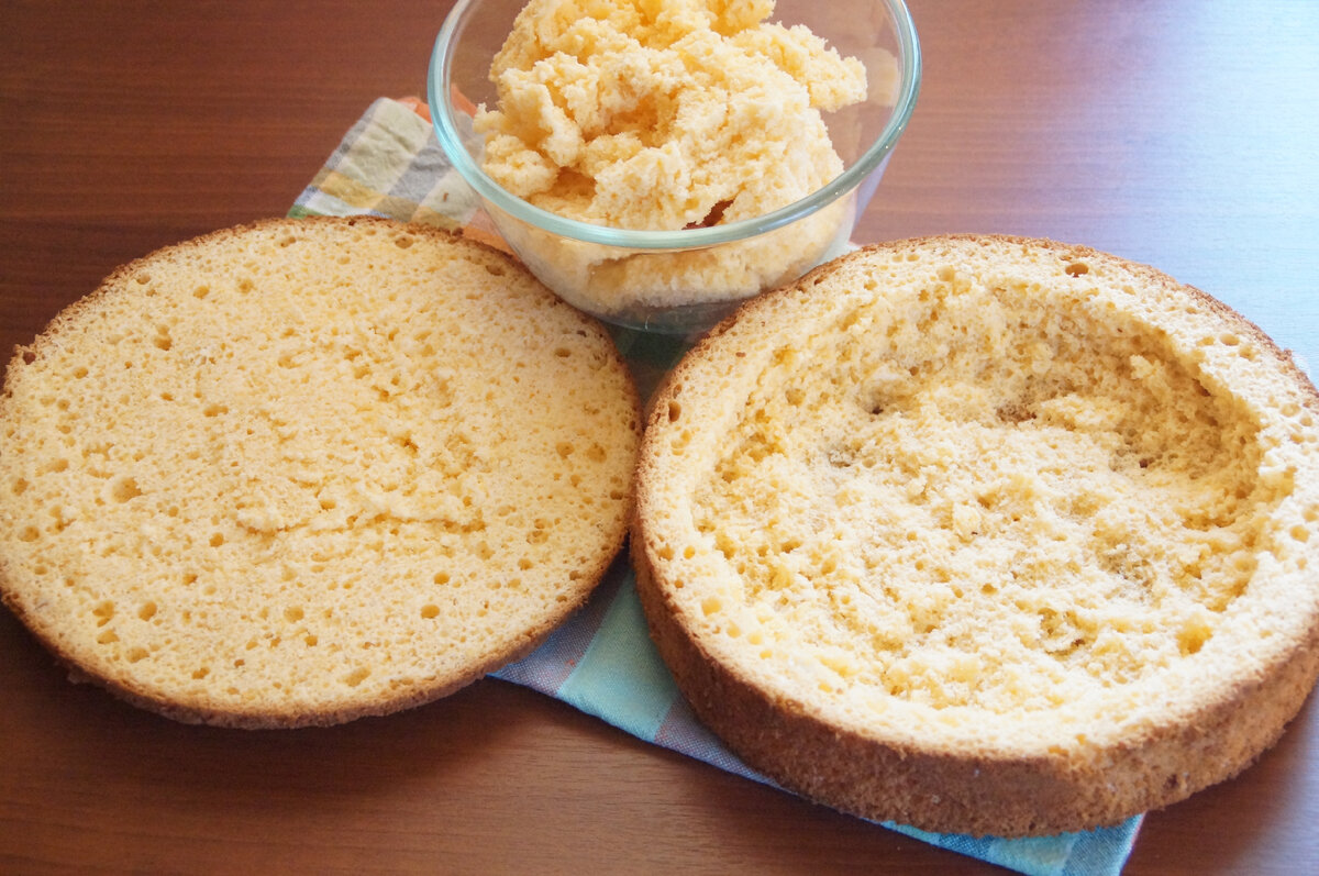 2. У готового бісквіта зрізати верхівку, товщиною близько 1 см і вирізати з середини м’якоть бісквіта, залишаючи по краях і знизу близько 1-2 см. Крихти відкласти.