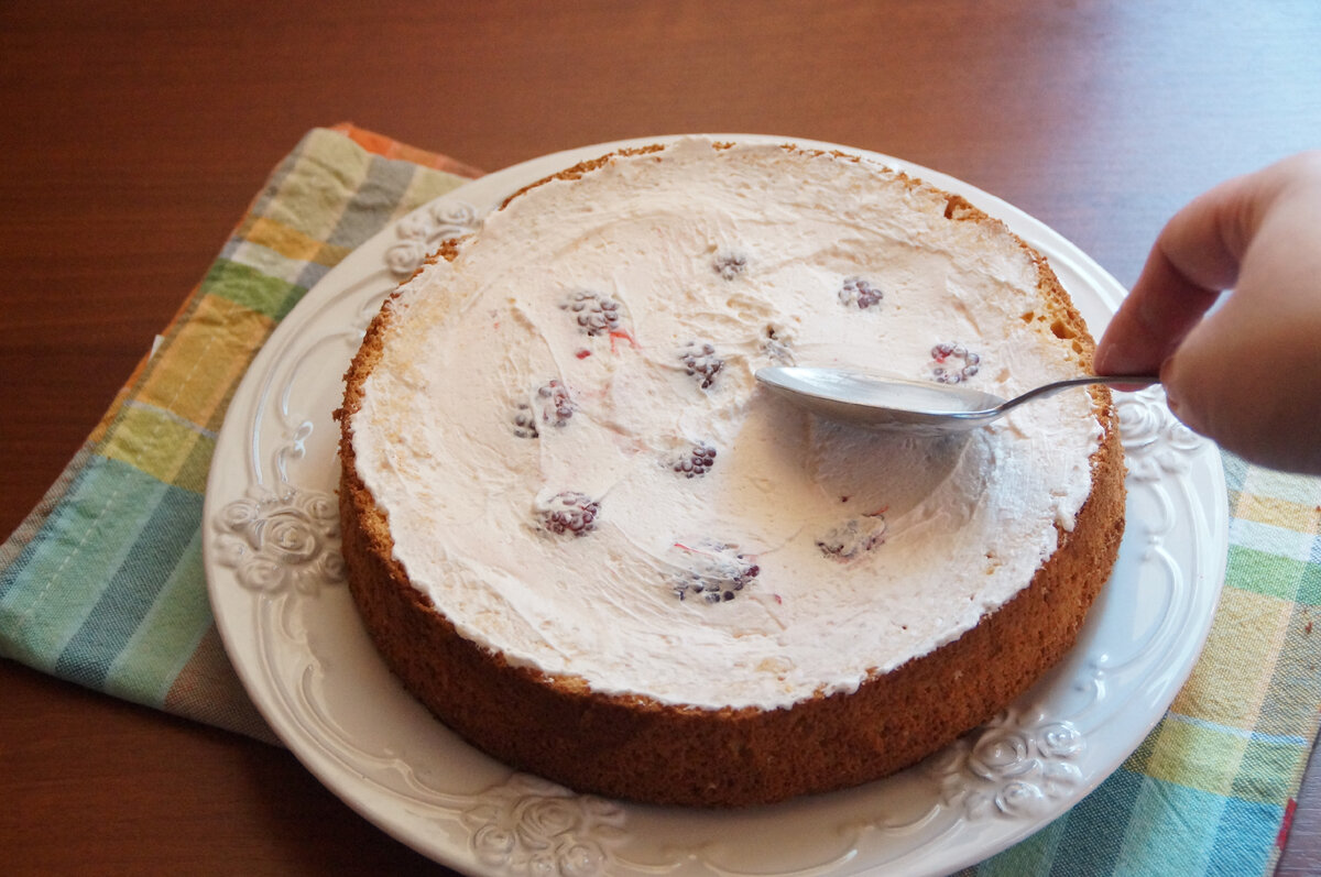 4. Заповнити кремом і ягодами бісквіт. Закрити зрізаною кришкою.