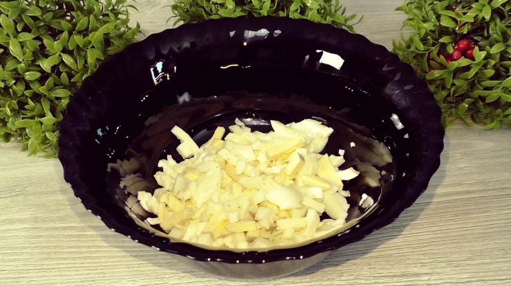 Зварити яйця – 10 хвилин на середньому вогні, потім охолодити під проточною водою і нарізати, відправити в салатник.