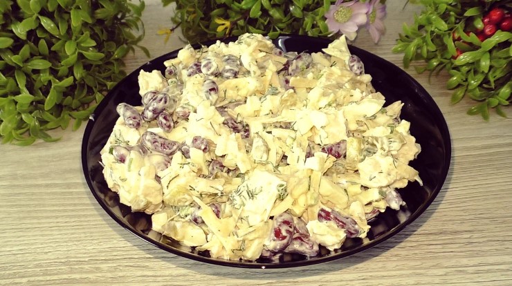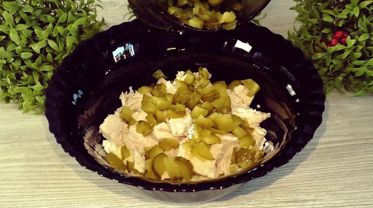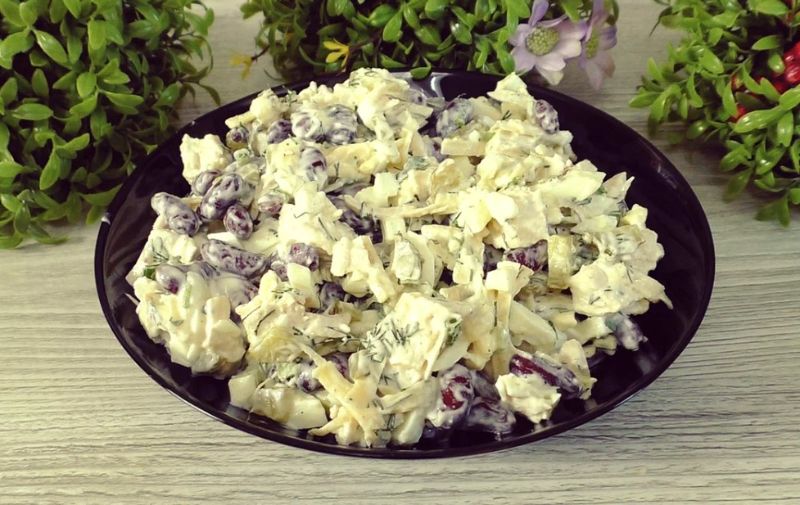 Простий у приготуванні, ситний і дуже смачний салат із консервованою квасолею (квасолю можна і самим відварити), курячою грудкою, та маринованими огірками. Такий салат може замінити обід через великий вміст білка. Можна подати на вечерю.