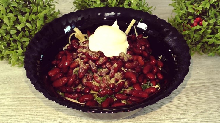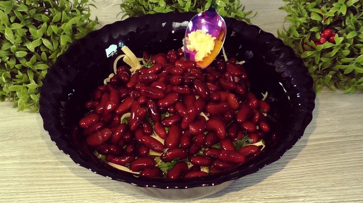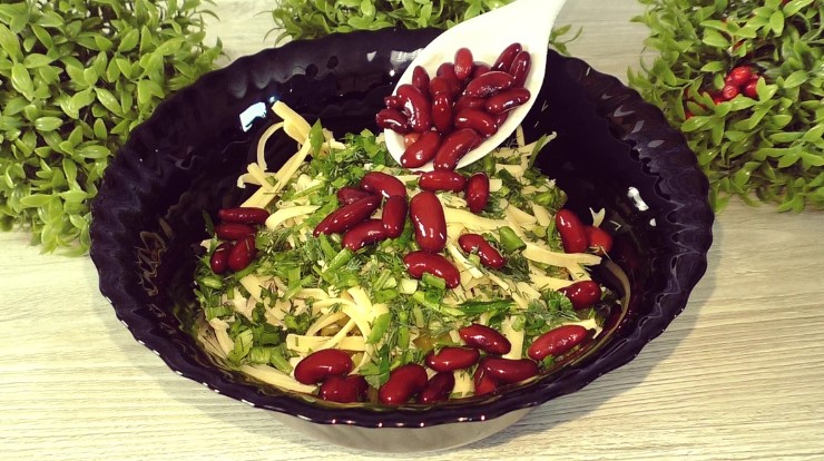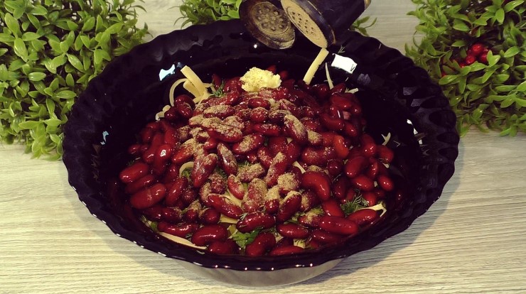 Квасолю (якщо консервована) промити, дати воді стекти і відправити до решти інгредієнтів.