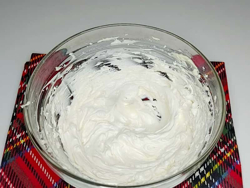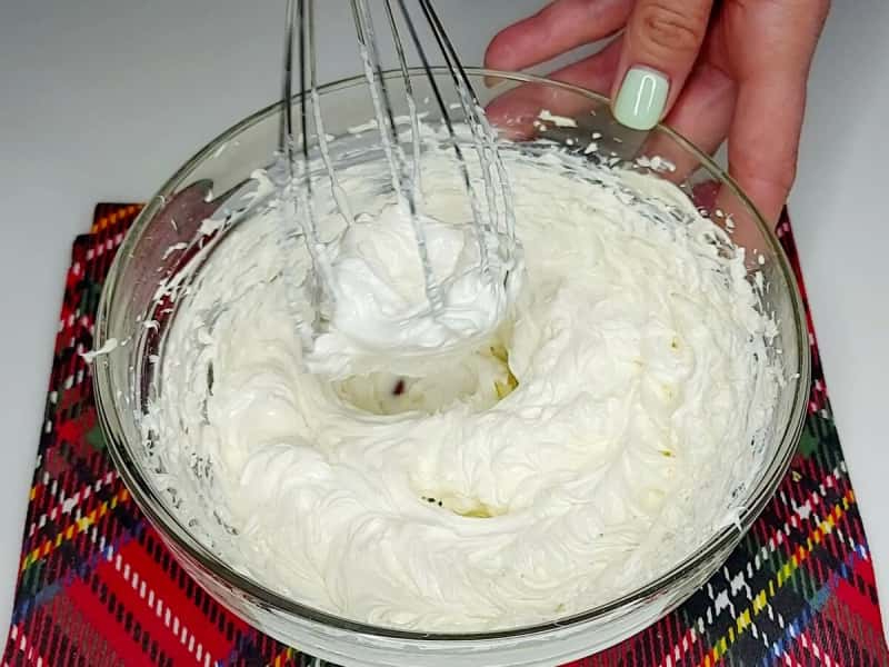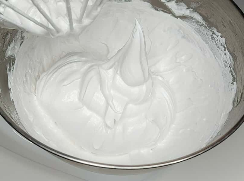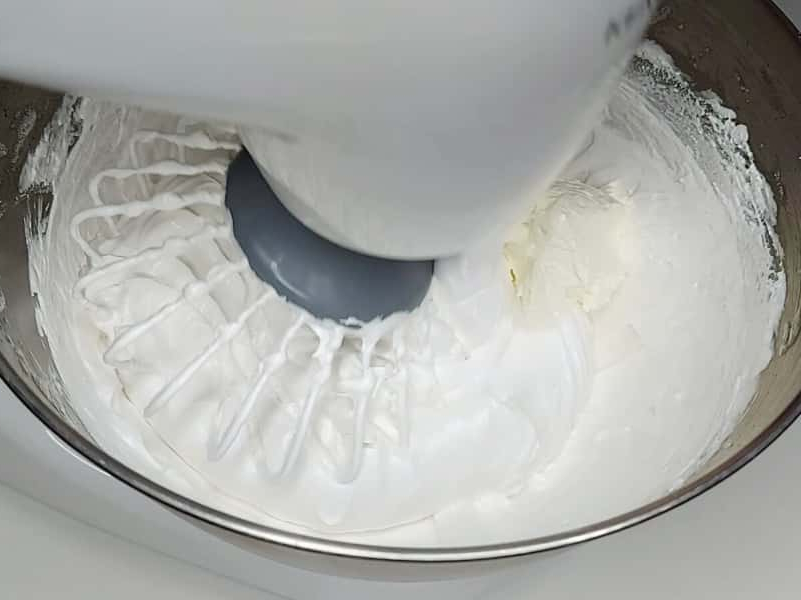 5. Тонким цівком, не перестаючи збивати, поступово влити гарячу суміш у яєчний білок. Не лити на вінчик. Після збивати на максимальних обертах міксера хвилин 7-8 до стійких піків. Суміш повинна вийде щільною і глянцевою.