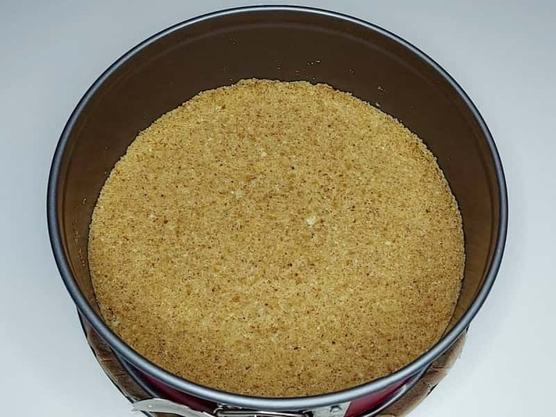 3. Форму, діаметром 18 см, застелити пергаментом. Крихітку розподілити на дні форми і утрамбувати, за допомогою склянки з плоским дном.