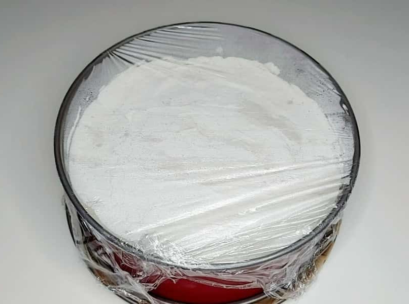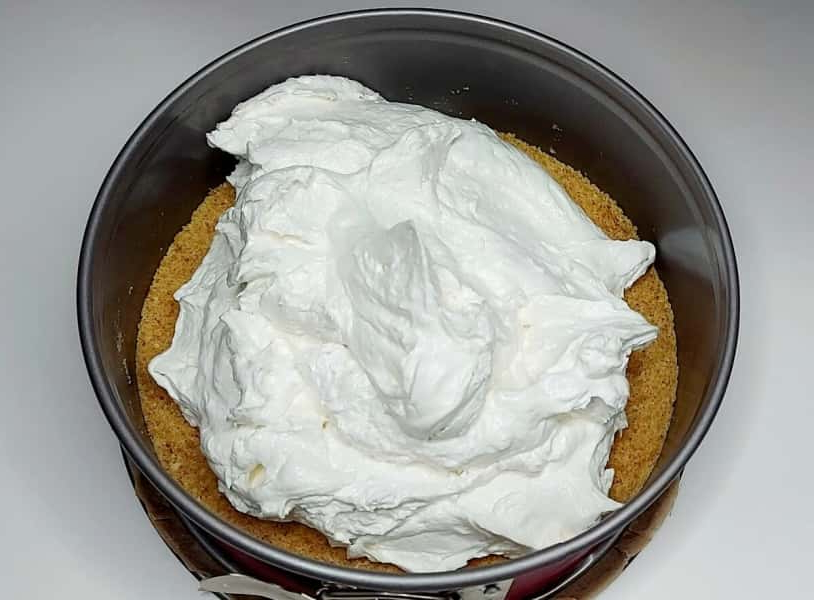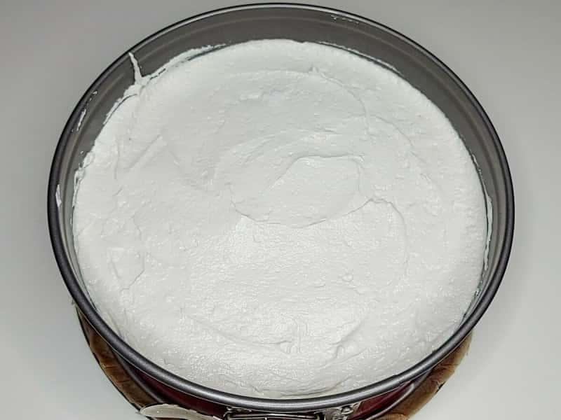 7. Викласти суміш у форму поверх основи з печива. Накрити харчовою плівкою та відправити в холодильник години на дві-три, до повної стабілізації суфле.
