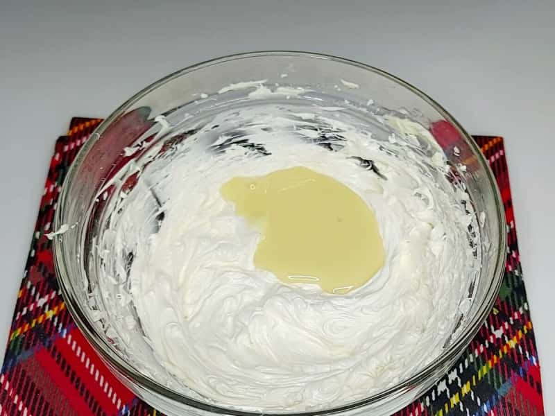 2. Продовжуючи збивати поступово додати згущене молоко. Збивати хвилини 2-3.