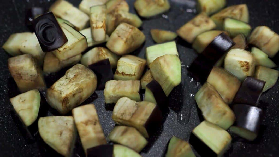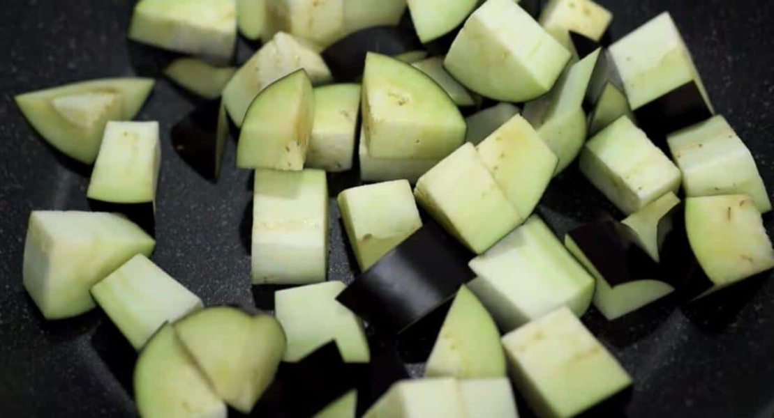 Баклажан нарізаємо на шматочки середнього розміру, викладаємо на суху сковороду і обсмажуємо.