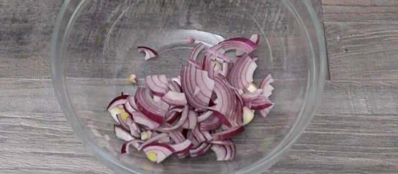 Червону цибулю нарізаємо півкільцями і перекладаємо в миску. Вливаємо сік лимона.