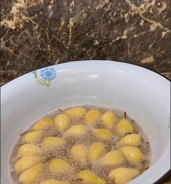 Все це треба робити швидко, щоб груша не потемніла. У таз де варитимемо грушу вливаємо 4 склянки води і цукор і розмішуємо до розчинення цукру.