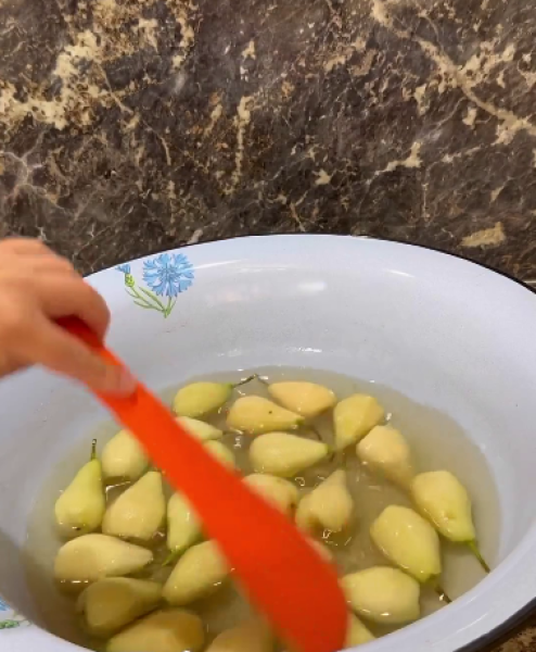 Для приготування цього варення нам знадобляться дрібні груші. Спочатку очищаємо шкірки від груші і до половини зрізаємо хвостик і закидаємо воду.