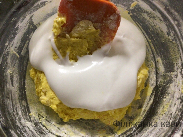 Потім в цю масу невеликими порціями додаємо білки. Після кожної порції білків ретельно перемішуємо масу, щоб не залишилося грудочок.