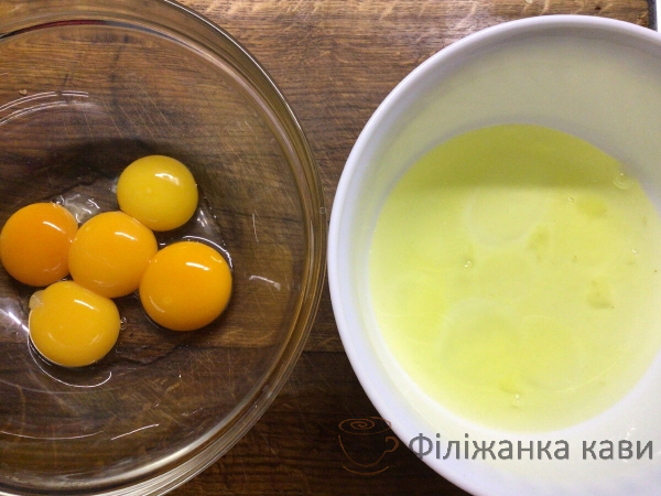Потім збиваємо жовтки з рештою 1/3 частиною цукру до пишної маси.