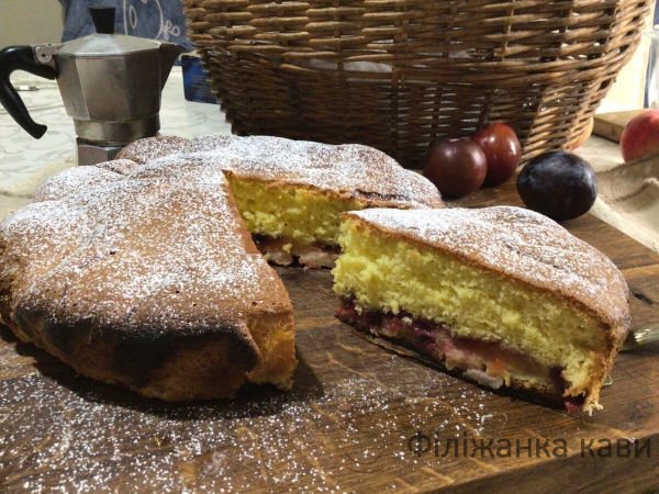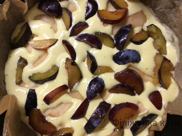 Потім на тісто викладаємо груші і сливу, або інші фрукти за бажанням!