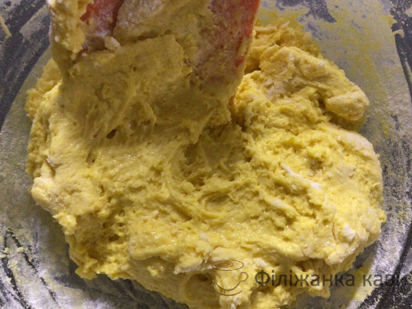 Потім в жовтки порціями додаємо борошно з розпушувачем. В результаті виходить дуже густа маса.