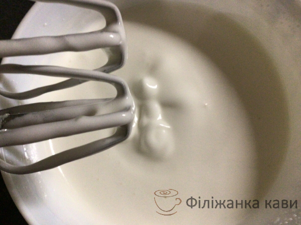 Спочатку міксером збиваємо білки з 2/3 частинами цукру. Цукор в білки додаємо порціями, і збиваємо до м’яких піків.