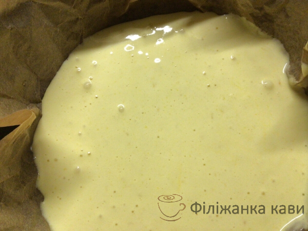 Потім половину маси перекладаємо на деко. На цей раз я випікала пиріг на глибокій сковороді, тому застелила її пергаментом.