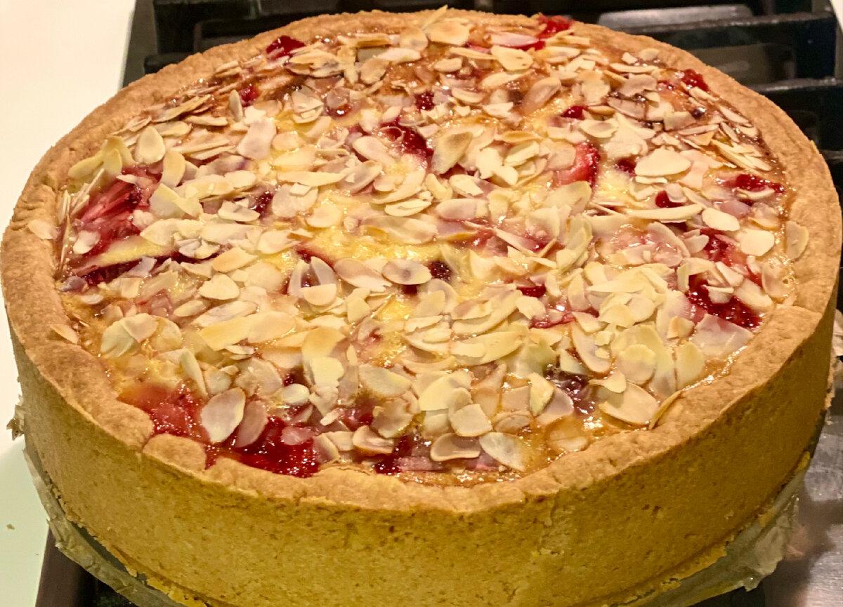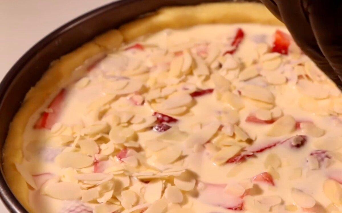 Форму кілька разів прокручуємо, щоб заливка добре розподілилася між полуницею. Верх щедро посипаємо пелюстками мигдалю.