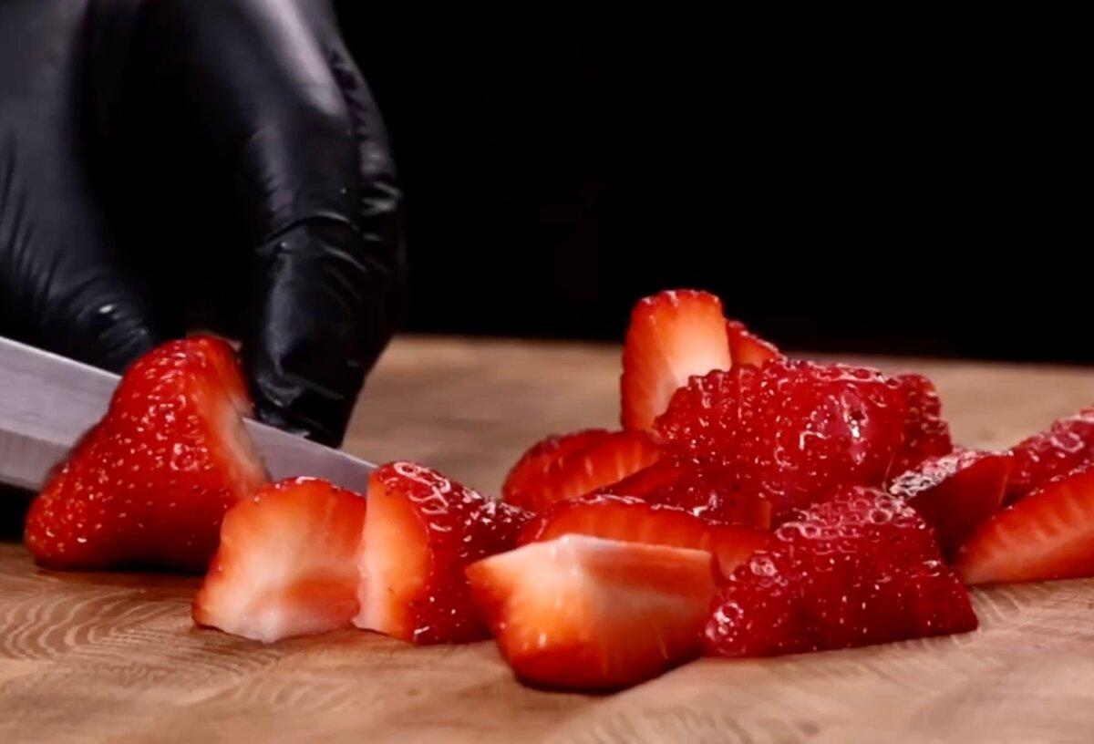 Тепер найсмачніше, полуницю миємо, обсушуємо, видаляємо плодоніжки і ріжемо на четвертинки.