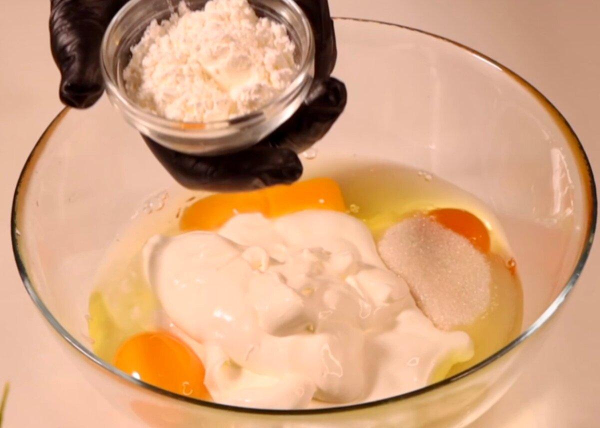 І готуємо сметанну заливку. У глибокій чаші змішуємо яйця, цукор, сметану і крохмаль.