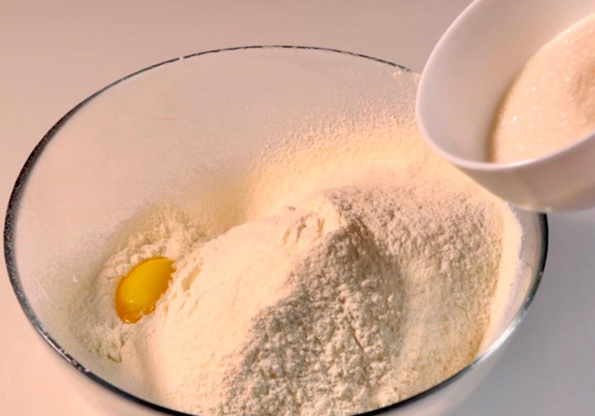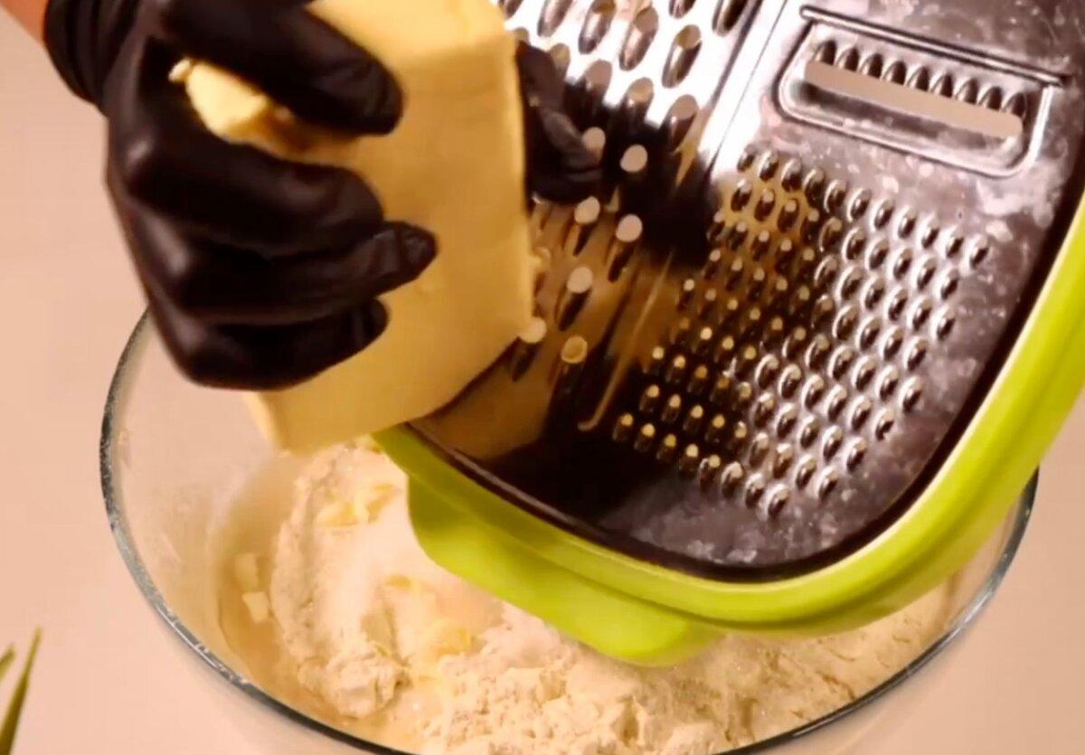 Спочатку готуємо тісто для основи нашого пирога. У глибокій чаші змішуємо просіяне борошно, жовток, цукор, розпушувач і воду. Далі тремо на великій терці холодне вершкове масло.