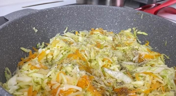 Тушимо цибулю і моркву до напівготовності, додаємо капусту і тушкуємо овочі під кришкою до готовності. В кінці солимо, перчимо і додаємо зелень за смаком, шматочок вершкового масла. Охолоджуємо начинку.