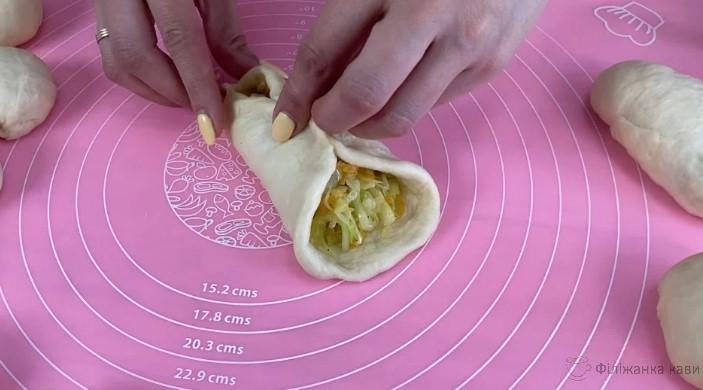 Розкачуємо кожен колобок у коржик, викладаємо капустяну начинку і формуємо пиріжки.