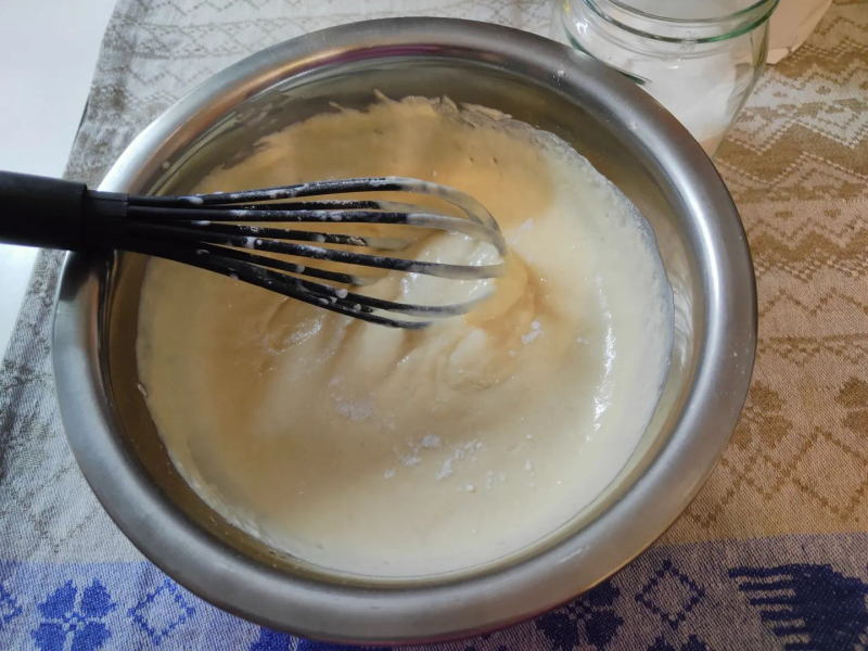 І лише тепер додаємо соду і добре перемішуємо. Тісто відразу стане пишніше, через реакції соди з кефіром.