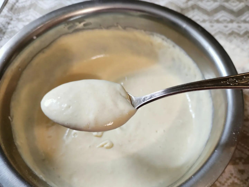 Тісто готове, коли його можна взяти ложкою і воно не стікає.