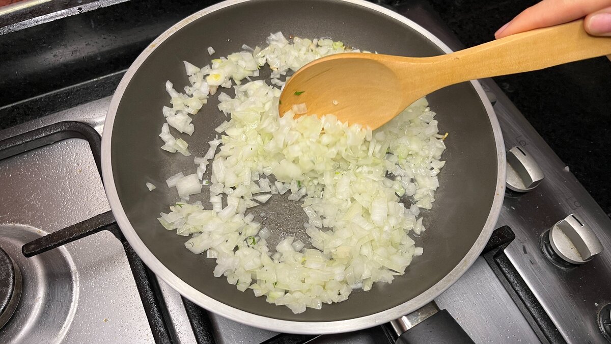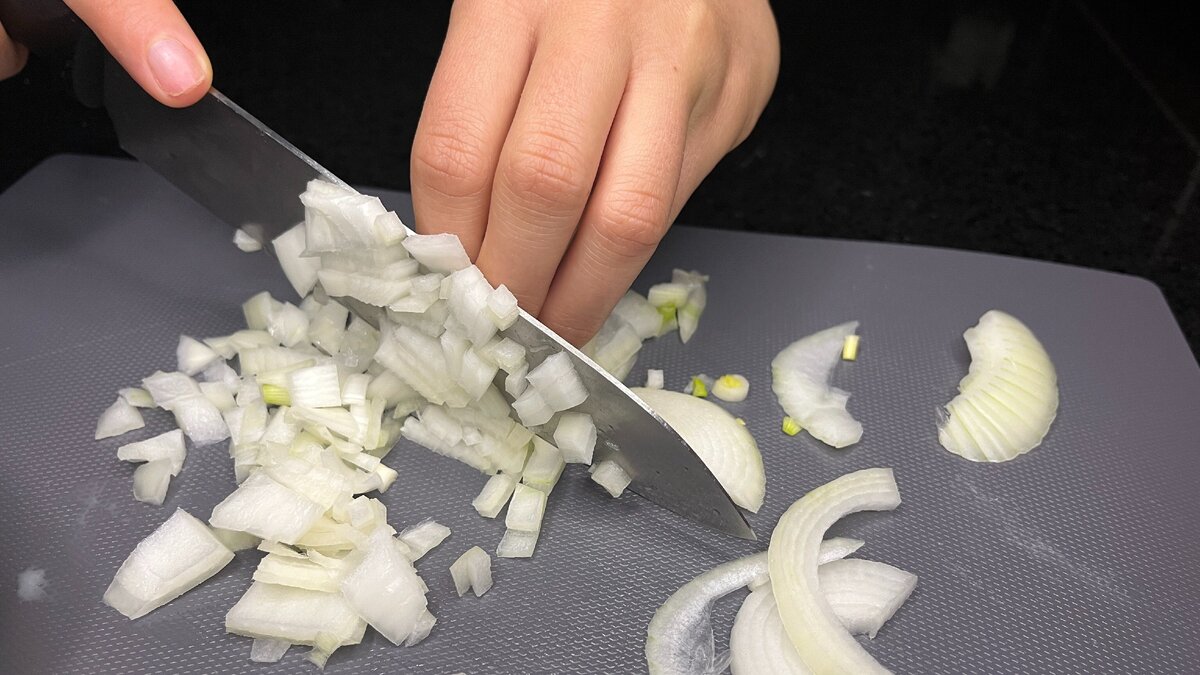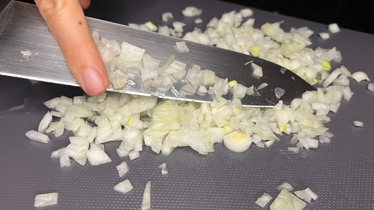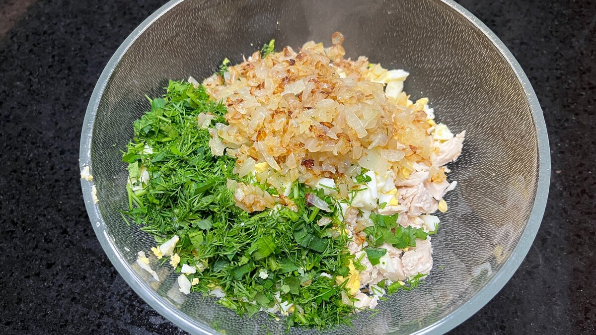 Спочатку робимо заготовки. Ставимо відварюватися курячу грудку і яйця. Дрібно ріжемо цибулю і обсмажуємо її до золотистості на олії.