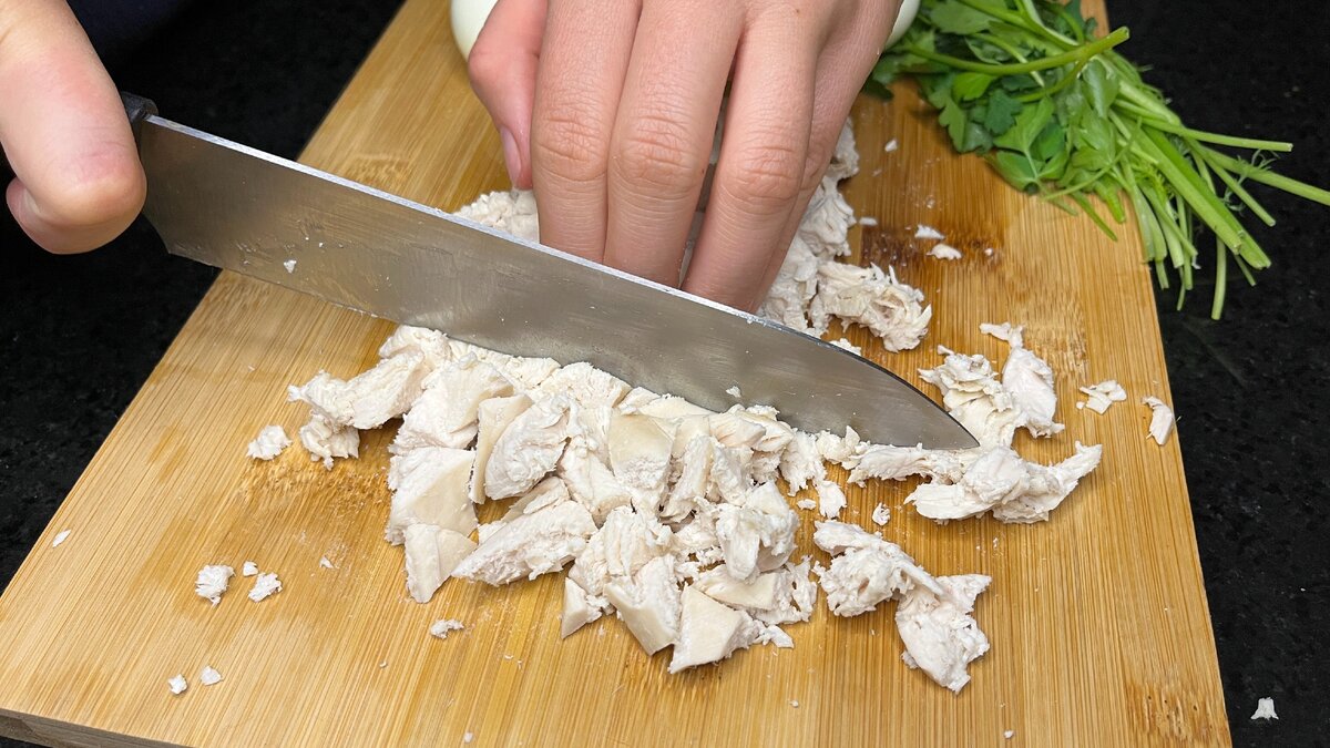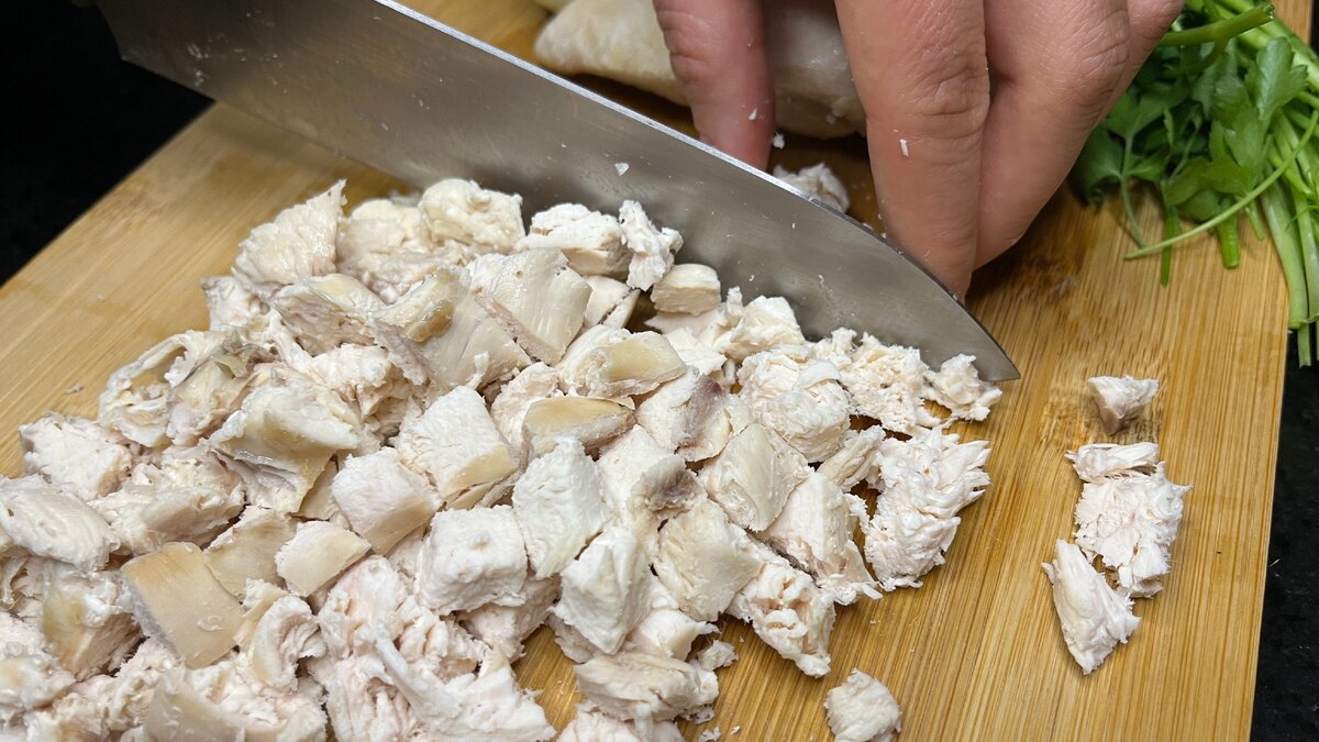 Відварну курячу грудку і яйця круто ріжемо кубиками.