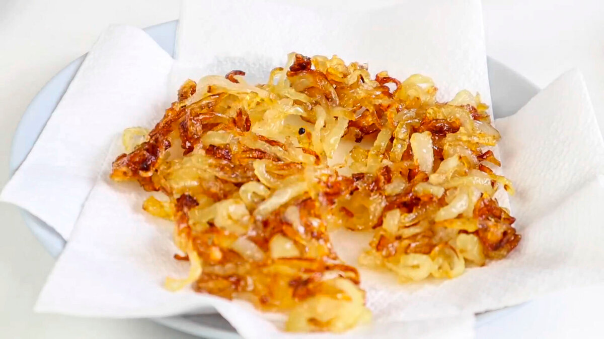 Цибулю ріпчасту 1 шт. нарізаємо півкільцями і смажимо на малому вогні до золотистого кольору. Потім викладаємо на паперові серветки щоб прибрати зайвий жир.