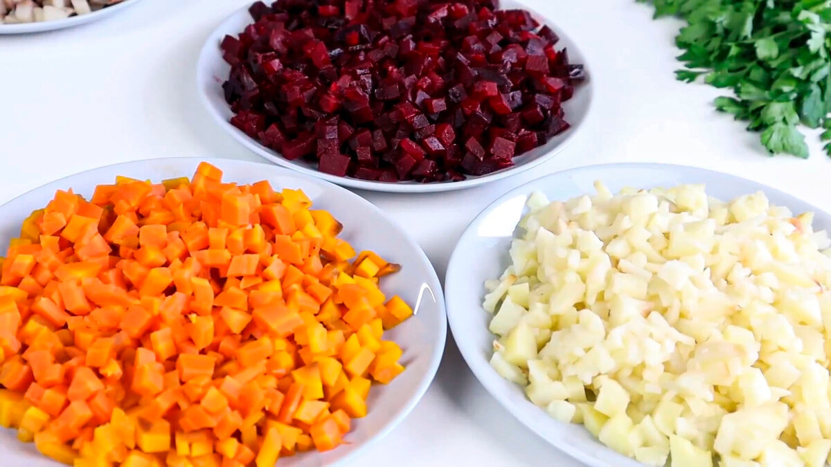 Овочі запікаємо в духовці ( можна відварити ) так набагато смачніше і нарізаємо дрібними кубиками. Картопля 3 шт., Буряк 2 шт. ( невеликі ) морква 1 велика.
