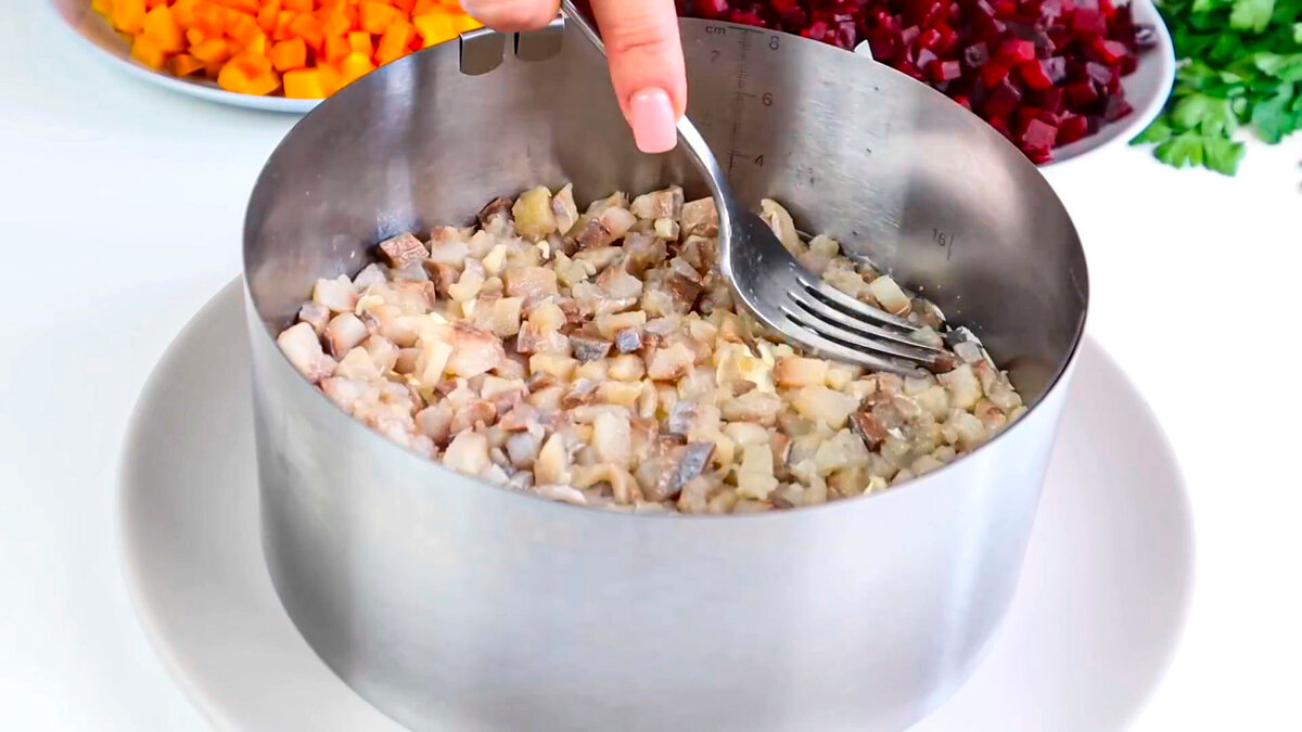Потім йде оселедець ( філе 3 шт. ) нарізаний кубиками і майонез.