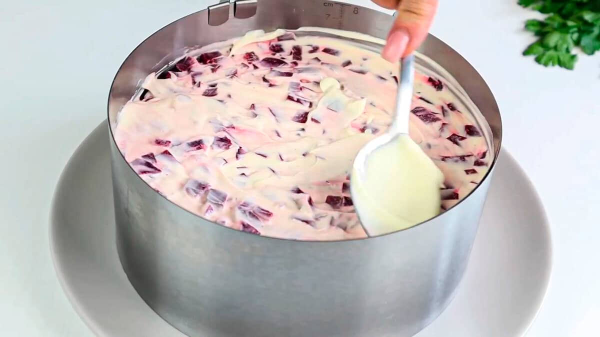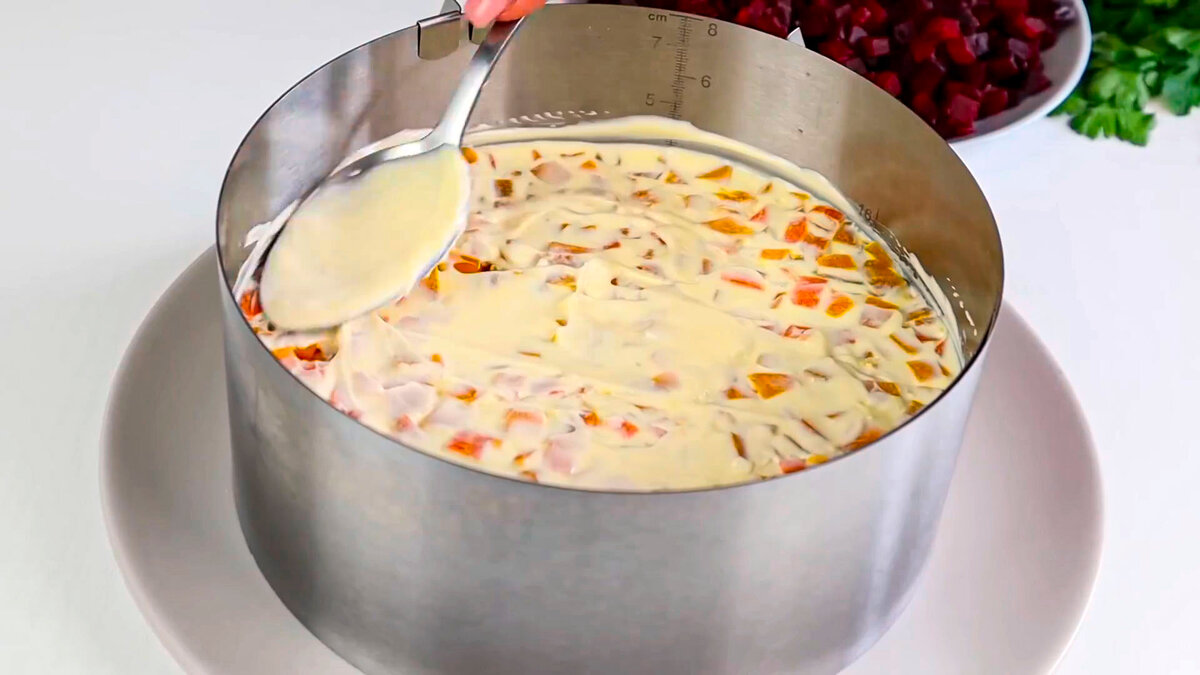 І останній шар буряк. Щіпка солі і перцю і змащуємо майонезом.
