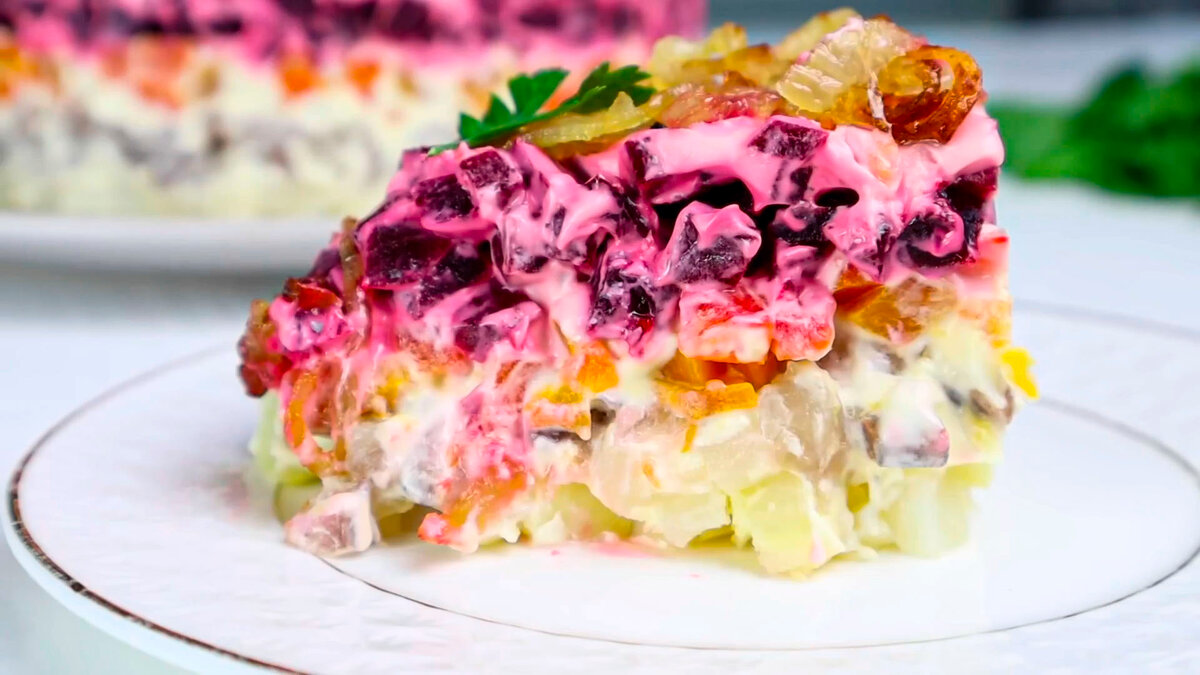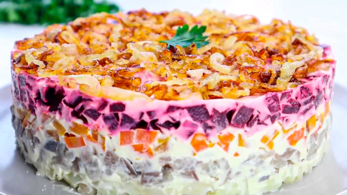 Сьогодні я хочу запропонувати приготувати дуже смачний святковий салат шарами “оселедець під шубою”. Але не класичний рецепт, а з смаженою цибулею – виходить дуже смачний салат з оселедцем.