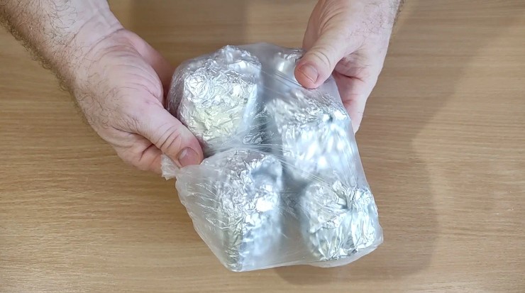 - Потім кожен шматочок загортаємо у фольгу, кладемо в пакет і відправляємо в морозилку на 3-4 години.