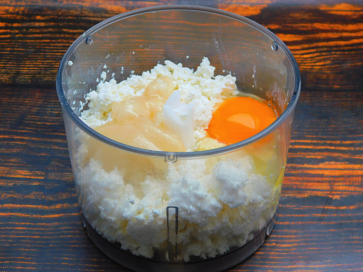 2. Зручно замішувати тісто в кухонному комбайні. У чашу висипати сир, розбити яйце, додати мед. Якщо він сильно зацукрований, поставити підігріти в мікрохвильовку.