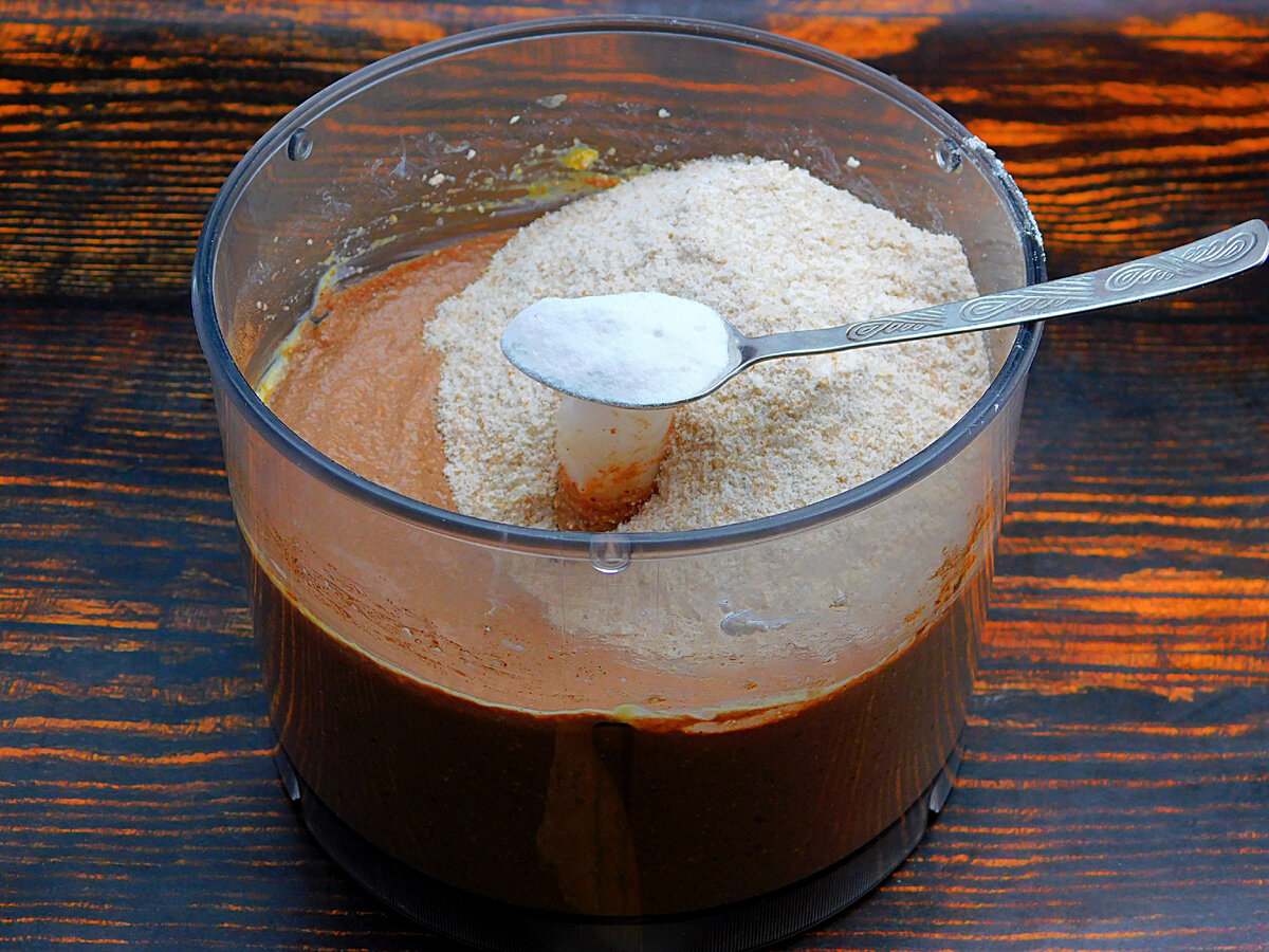 4. Знову перемішати. Додати половину цільнозернового борошна і розпушувач.