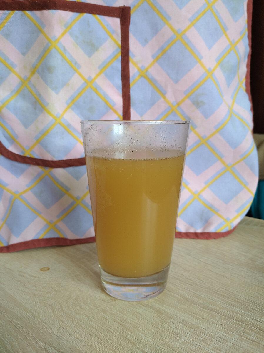 Процідила квас через марлю, складену в кілька шарів. Дрібні крихти хліба все одно проходять, тому в результаті квас мутнуватий, але це не заважає бути йому смачним.