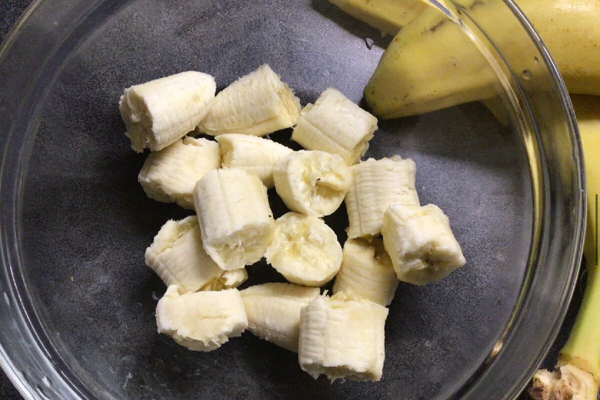 Очищаємо банани, нарізаємо на шматочки – 2 банана.